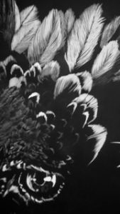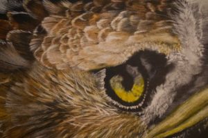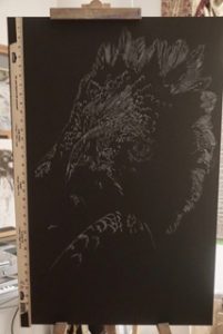 I apologize for missing this event! I’m in the midst of moving & have a lot going on. I just watched the video & I want to respond about the comment made regarding my birds being on “Black CANVAS”. That is incorrect! Those works she’s referring to are actually on Scratchboard. I realize a lot of folks don’t seem to be familiar with this medium. It is a masonite panel coated in kaolin clay & then ink. You draw out your image on it – I usually use a white colored pencil. Then you scratch away the black to create the image. By using various techniques, it’s possible to attain gradations in values. It’s much like pointillism in that way! This is a 24” x 36” piece that I did for my “Eagles of the World” series. It won 1st place last year in the Westerville Spring Art Exhibition. The 1st images are the drawn in colored pencil stage. Then I begin scratching out the details as seen in image #2). #3) is a series of close ups so you can see how the overall effect is accomplished. #4) is my reference photo – this is a Martial Eagle. They live in Africa! They are one of the world’s largest & most powerful Eagle species. #5 is the finished work. I created this piece employing the size to emphasize it’s compelling presence. It certainly works! This piece really commands a room! LOL! Since the birds are black & white, I left it without any color. One important aspect of creating a compelling work of Art is to know when to shut up & leave it alone! “Martial Injunction” is this title.